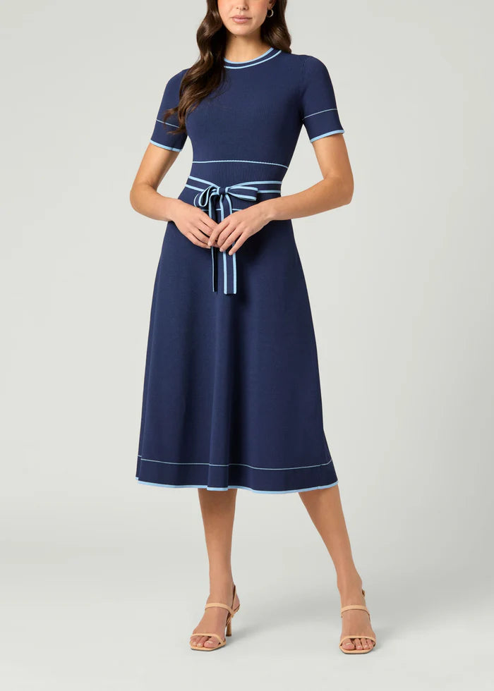 Classic ribbed knit midi dress. This style features a round neckline, short fitted sleeves, a fitted bodice, a tall rib waistband with a separate tie belt, and a full, A-line midi-length skirt. There is contrasting piping detail along the neckline, sleeve edges, waistband, tie belt edges, and skirt hem. Unlined. Slip on.