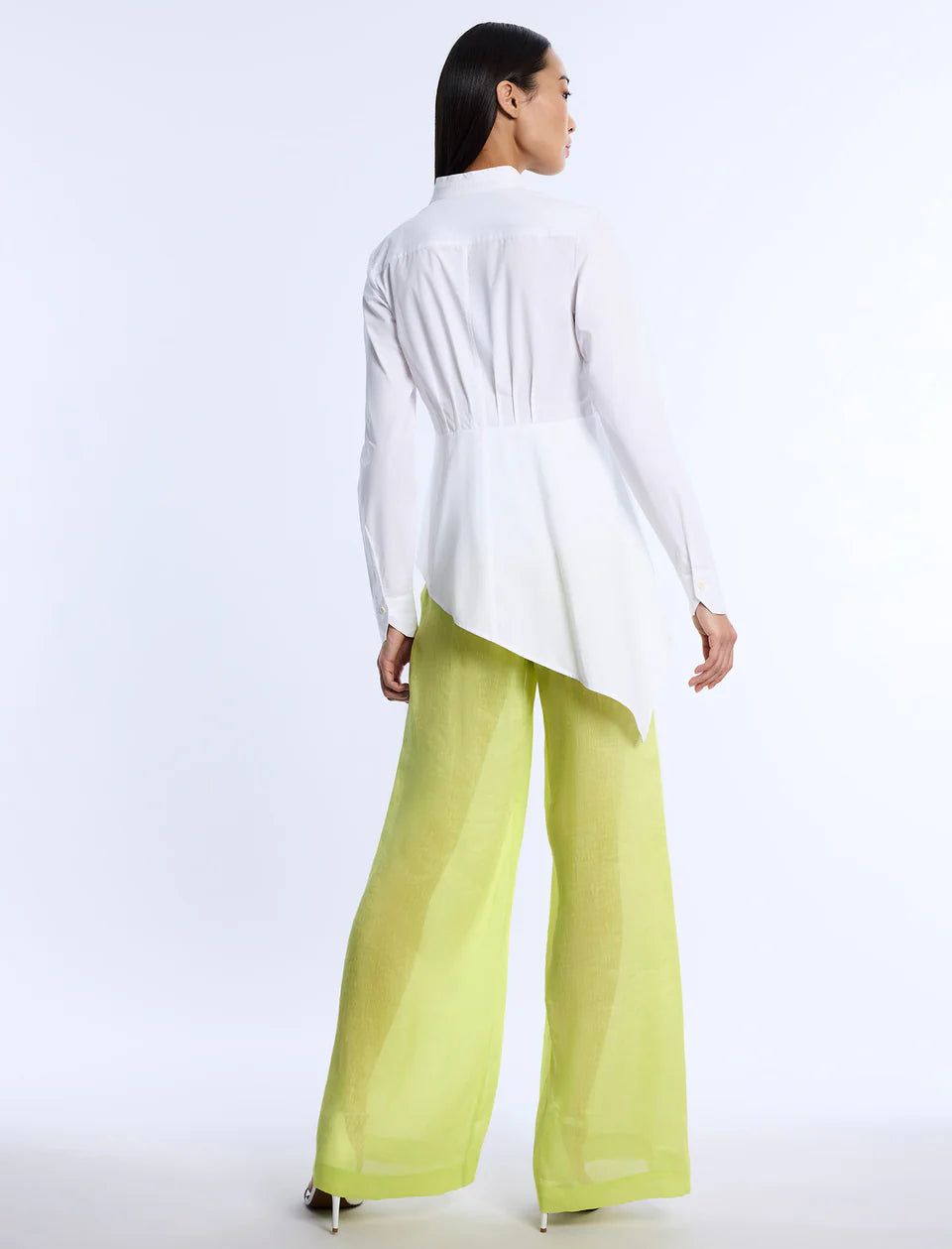 Tailored shirt crafted from crisp cotton poplin. Topped with a mandarin collar and subtle bodice pleating for a polished fit. Done in a long-sleeve silhouette with a flared, asymmetric hemline for modern movement. Finished with front button closures and a tapered back.