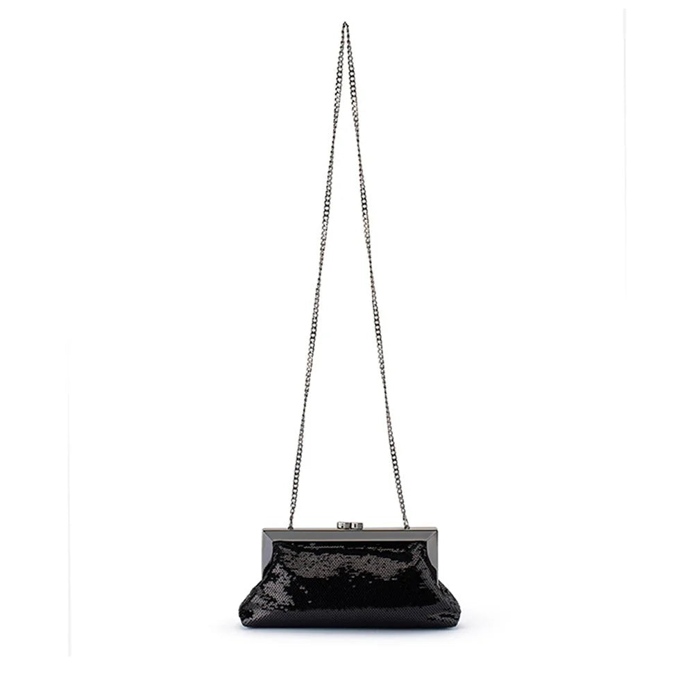The Sequin clutch is a fun framed bag covered in tiny sequins for a sophisticated and timeless look. The classic shape of this soft bag combined with the hardware frame and kiss lock closure make it a versatile option suitable for any occasion, with plenty of room inside for your night out accessories. It includes a shoulder chain and additional chain handle for multiple styling options.