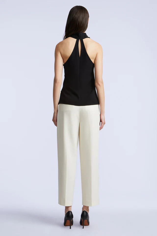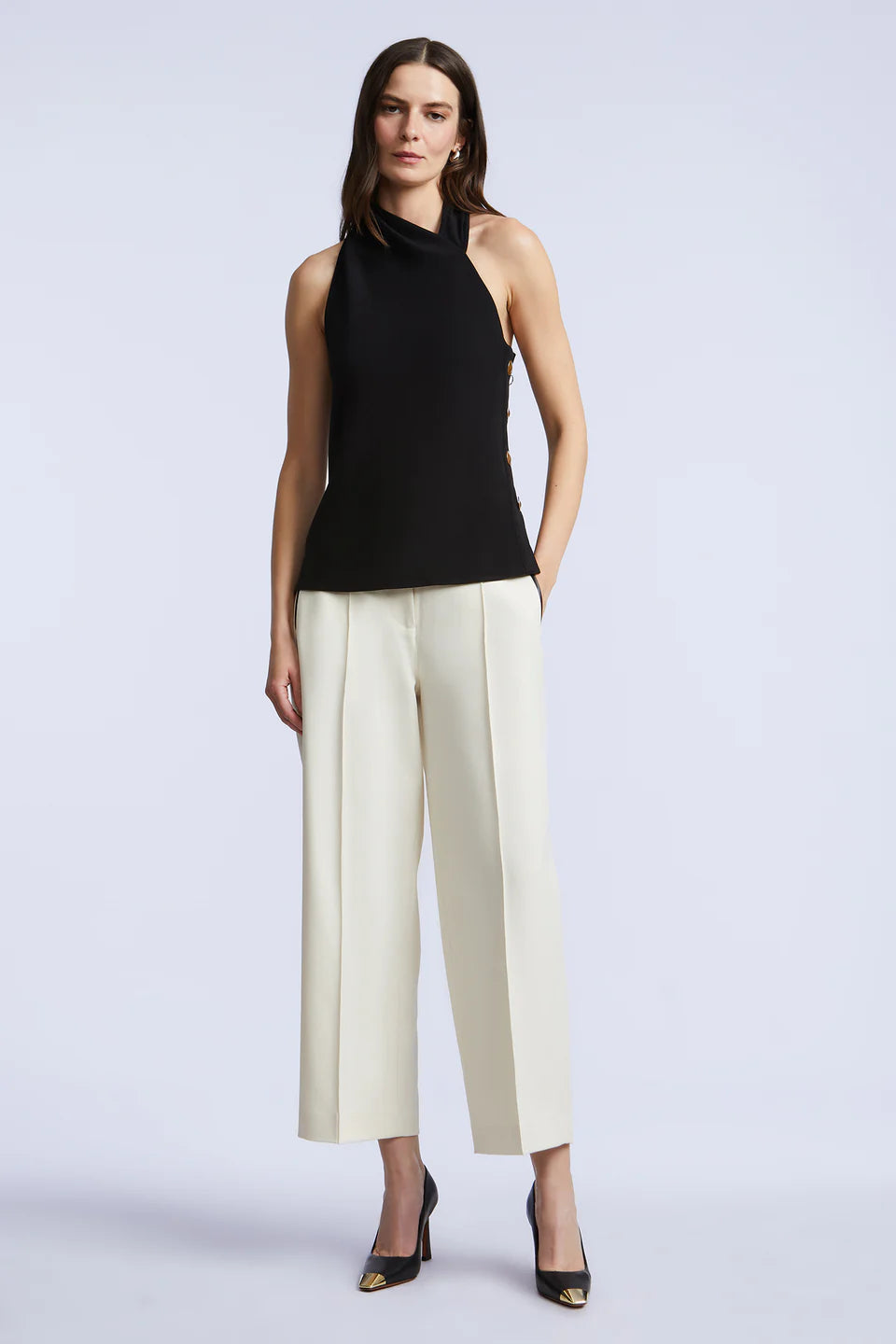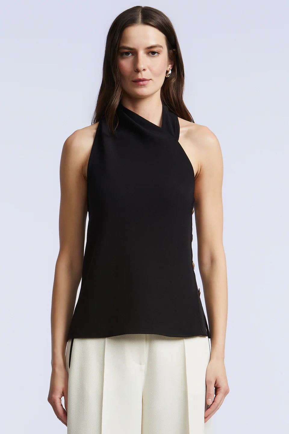 Asymmetric halter top crafted in smooth crepe with a clean, modern drape. Finished with side button detailing for a subtle twist. A polished pick for work dinners, nights out, and everything in between.