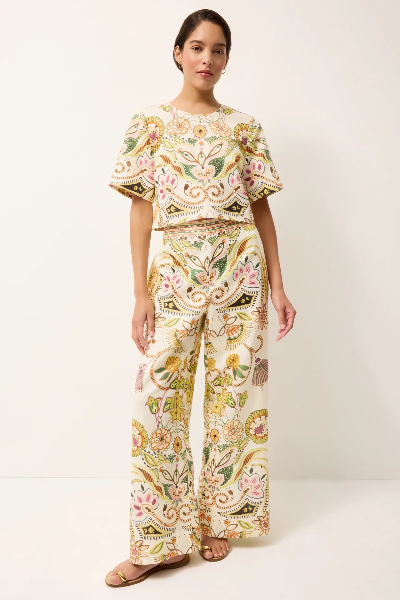 Made for the crop-top devotee, this linen-cotton silhouette pairs a clean, tailored cut with a buttoned back and an artful floral placement print. It captures the ease of vacation on the Mediterranean and looks especially chic with the coordinating high rise, wide-leg Bennett pant in Haven.