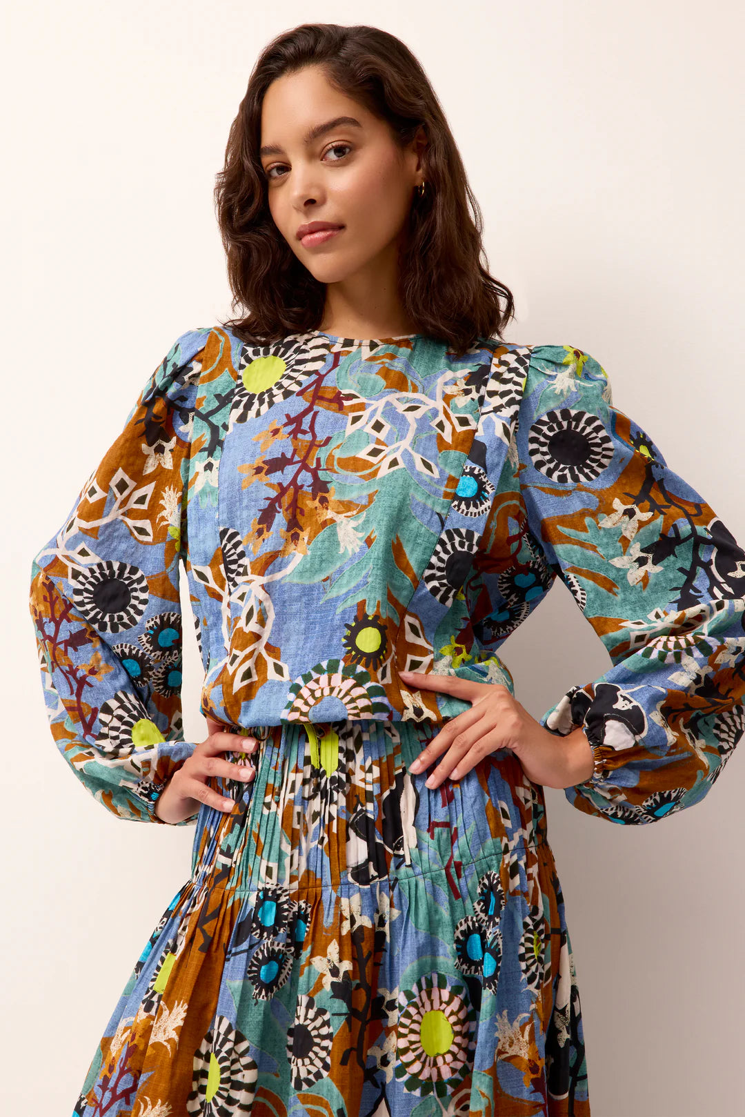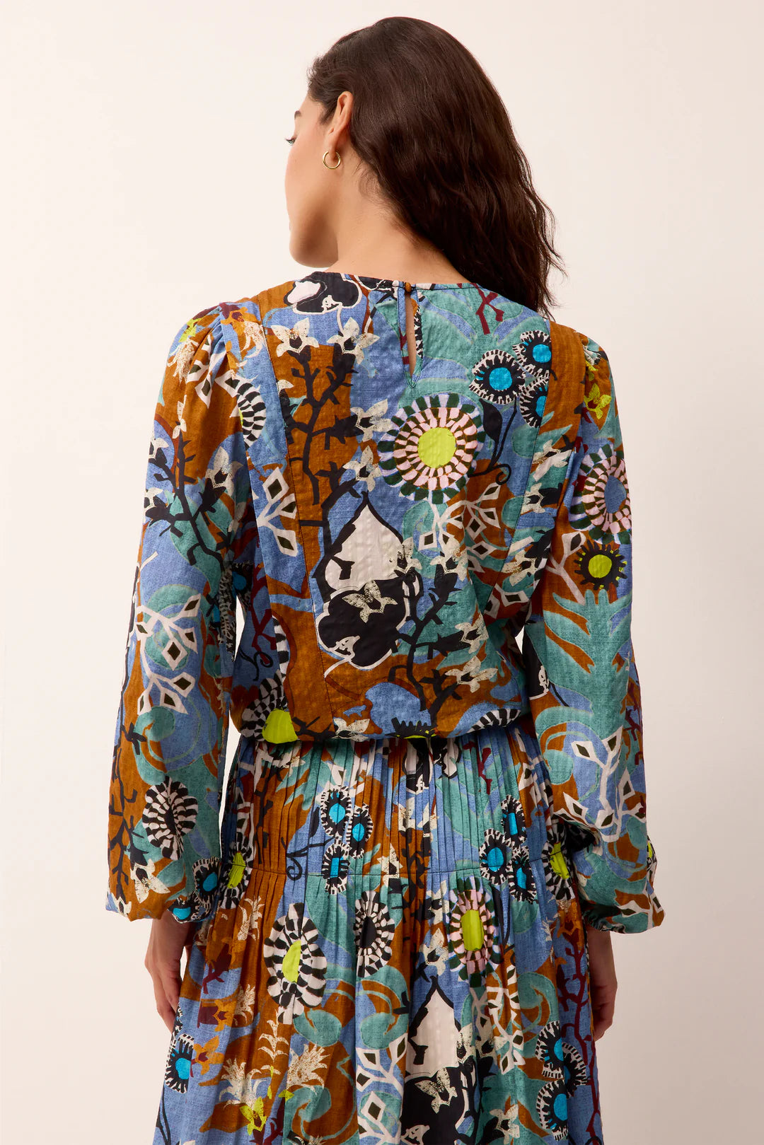 With its relaxed fit, flowy silhouette, and flange-pleated yoke, the Hallie top is equal parts comfortable and stylish. Long sleeves and waist ties add subtle structure, while our garden-inspired Oasis print brings a bold, seasonal touch. Dress it up or down.