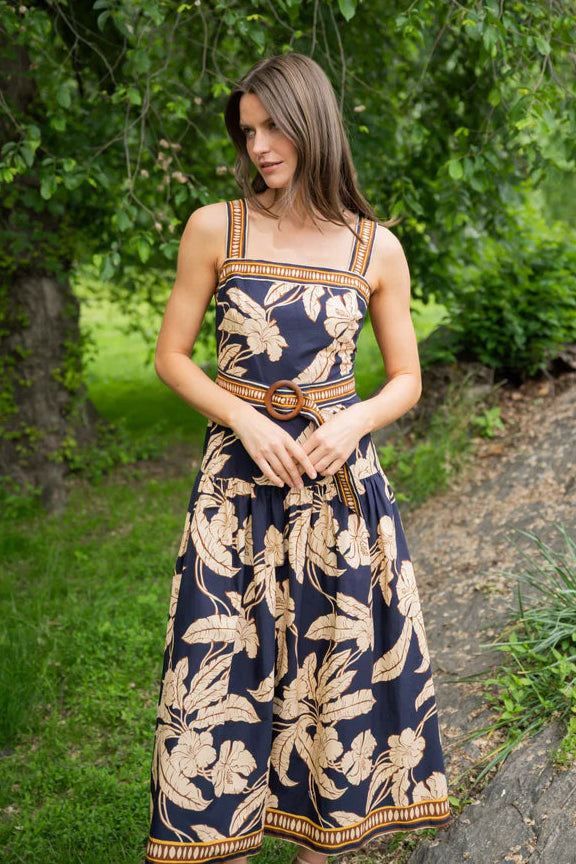 Beautiful, sleeveless, printed cotton midi sundress. This style features a square neckline with wide shoulder straps, a fitted bodice with interior bustier construction for added support, a separate tie buckled belt at the waist, and a full A-line midi length skirt with side seam pockets. There is a contrasting border print at the shoulder straps, neckline, belt, and along the skirt hem. Bodice lined. Skirt unlined. Hidden back zipper.