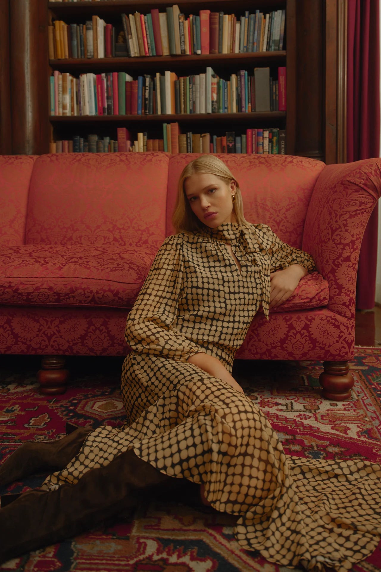This printed midi skirt with feminine design details like the asymmetrical ruffle at the hem is classic Marie Oliver complete with a scene-stealing pattern. While Krista is striking on her own, the silhouette wins a permanent place in our holiday party wardrobe rotation courtesy of the Dapple print, a glimmering, black-and-gold dot motif that recalls the twinkle of Christmas lights through a darkened living room window.
