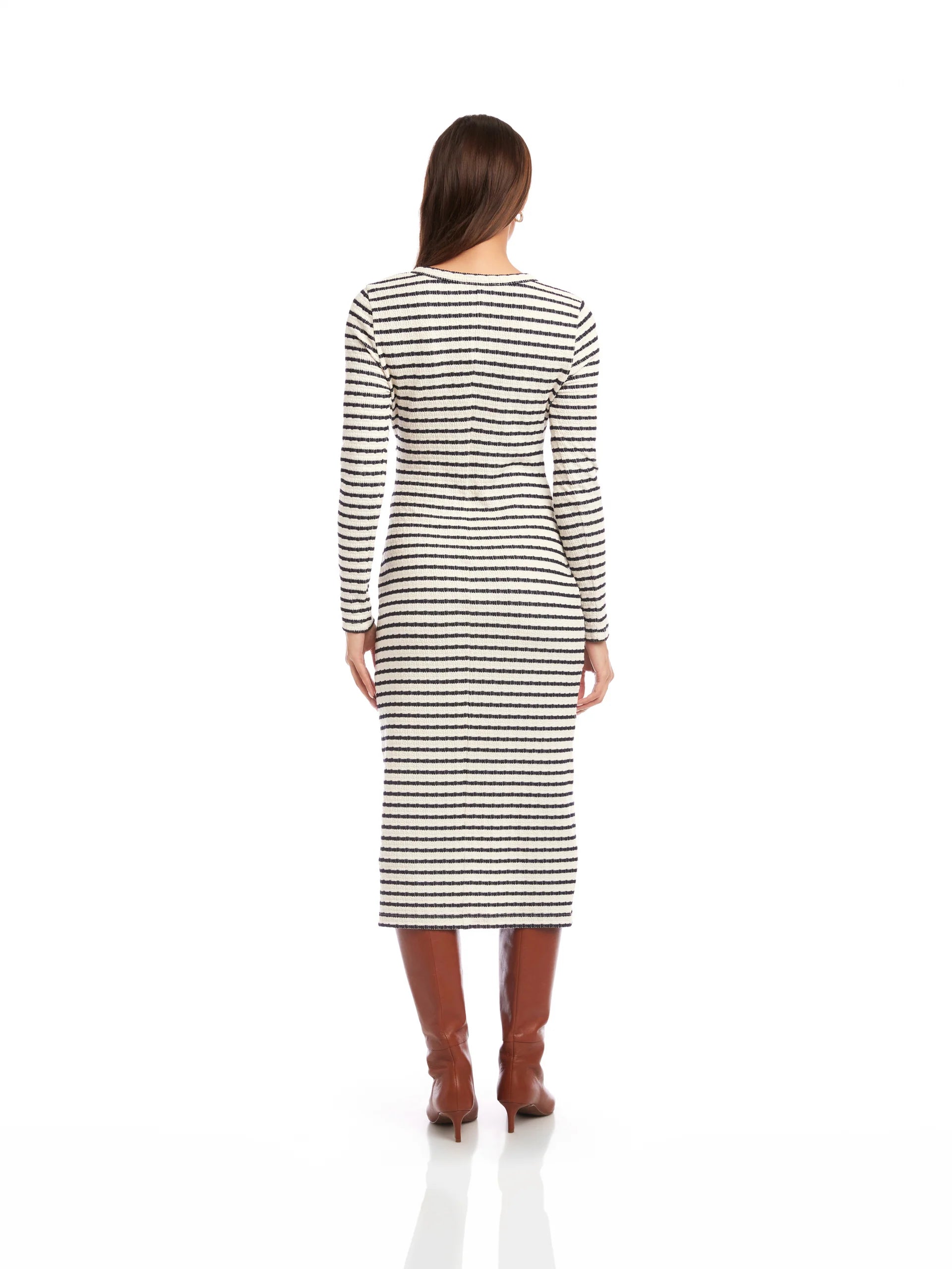 This playful Maddie Dress features a chic striped knit fabric that adds a fun pattern to your look. The side twist detail creates a flattering silhouette, while the front slit adds a flirty touch and ease of movement. Perfect for turning heads with effortless style!