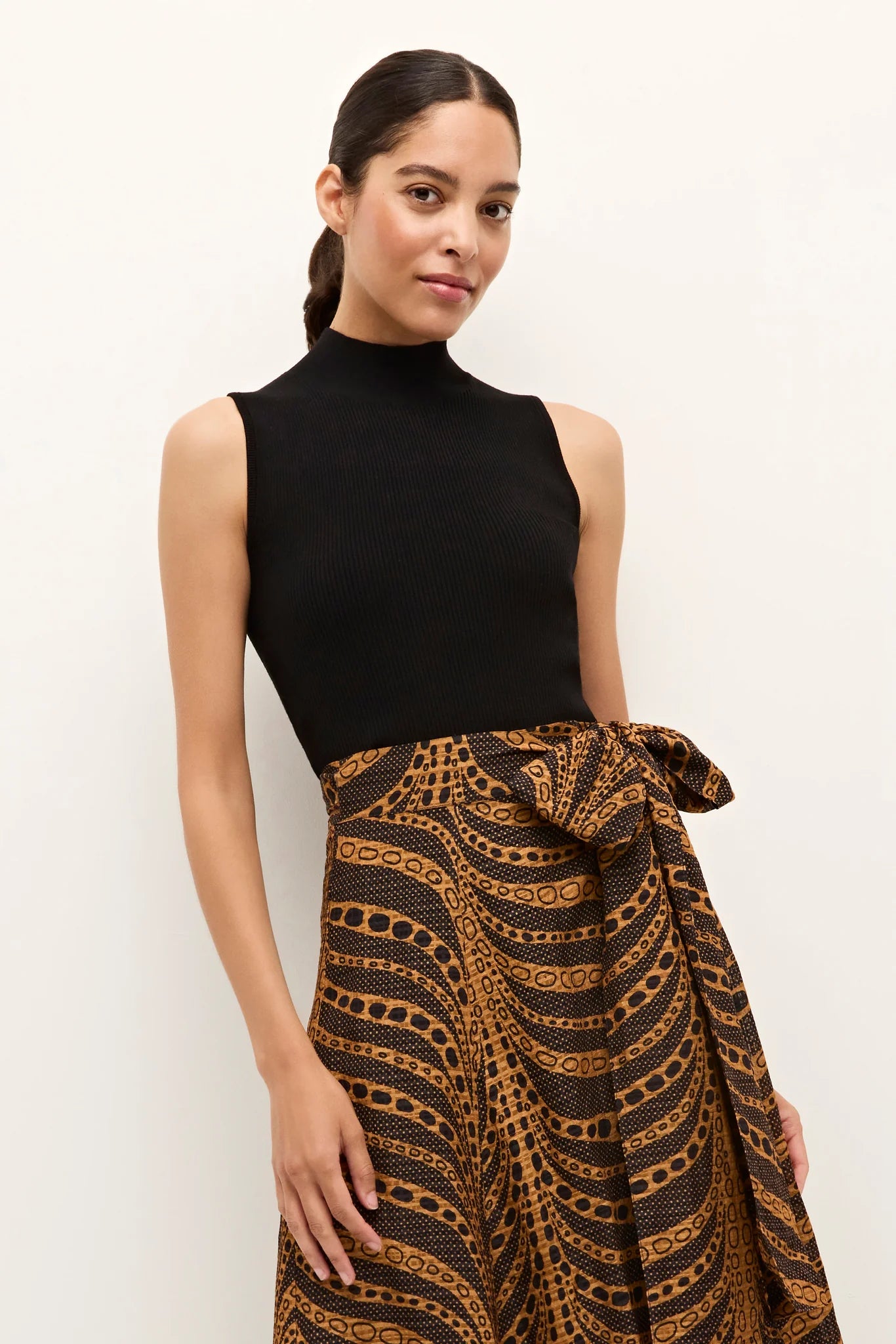 Our latest core solid, we’ve paired our new Mazie top, a light compressive rib knit, with just about everything, from our vegan leather mini skirts to wide-leg Palazzo pants. The sleeveless mock turtleneck, which comes in four signature solids, including classic black, is perfect for those early fall days that still feel like summer.