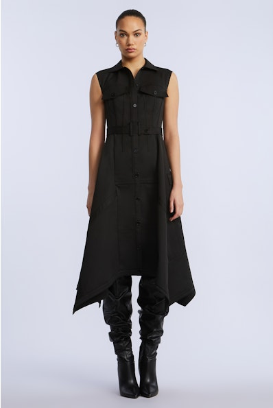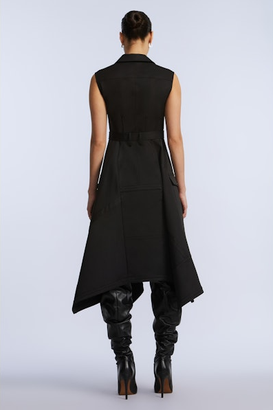BCBG's newest arrival is sleek and chic for your next event. The scarf hem and side pocket details add a fun twist to an otherwise classic silhouette.