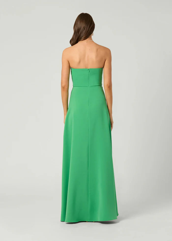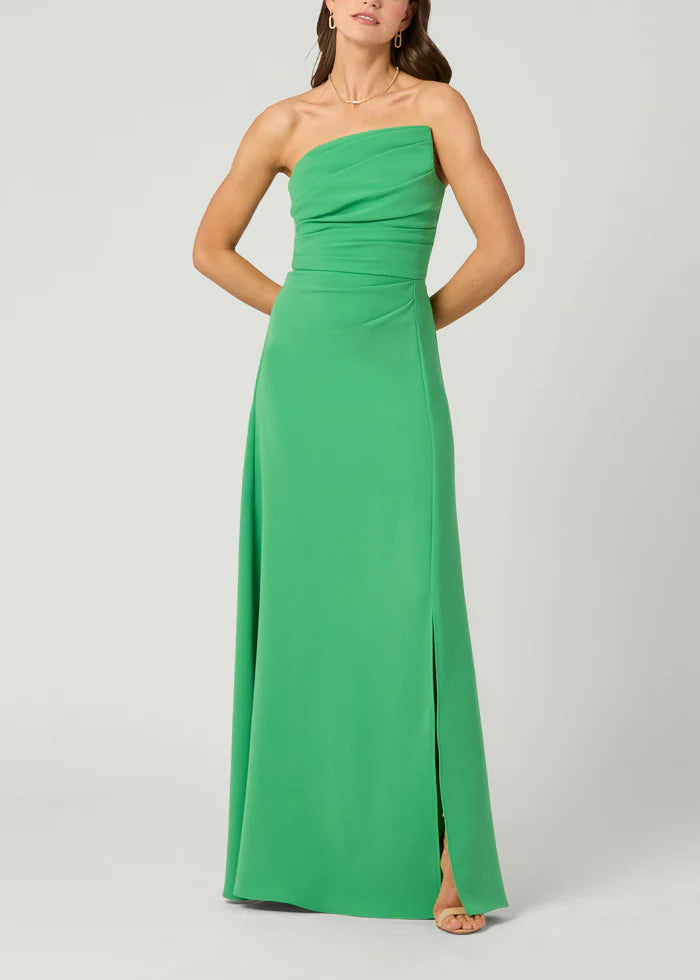 Gorgeous green, stretch crepe gown. Style features an asymmetrical strapless neckline with a beautifully draped bodice. The slight A-line skirt has a side slit. Full bustier construction inside. Bodice lined, skirt unlined. Hidden back zipper.