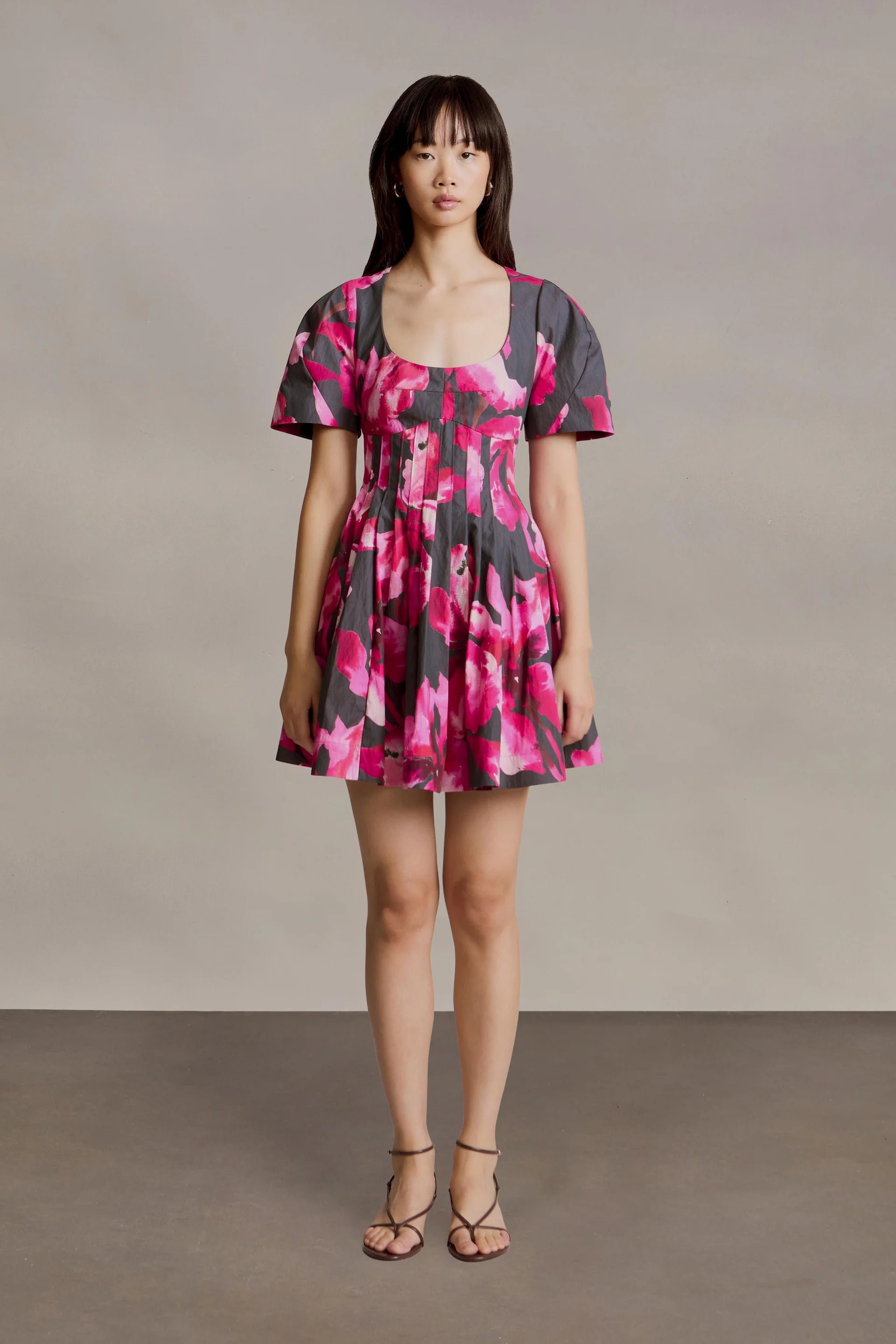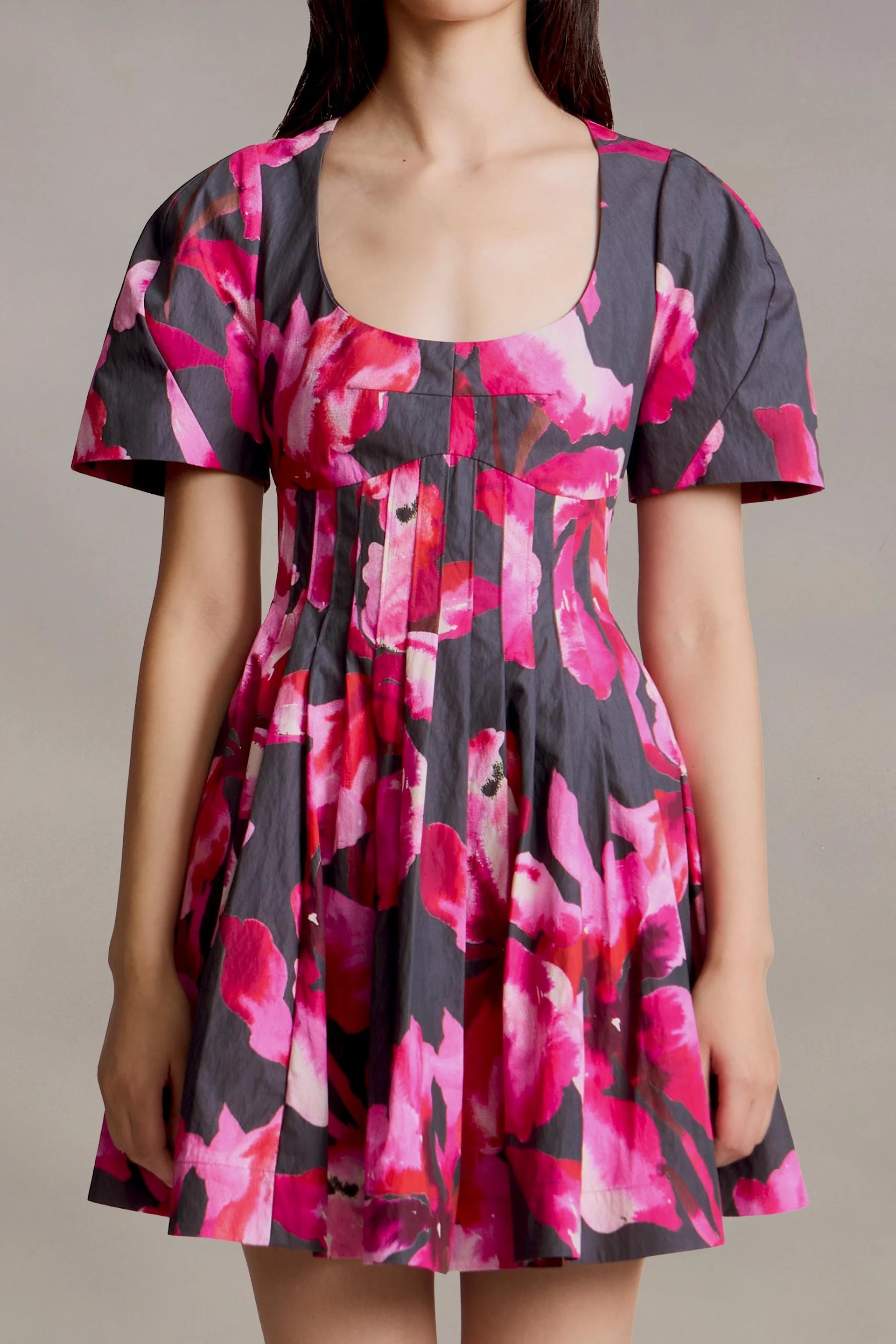This puff-sleeve mini is cut in waxed cotton with allover pintucks and a floral print inspired by hand-painted artwork. The pleated body brings the twirl—just spritz, slip on, and go.